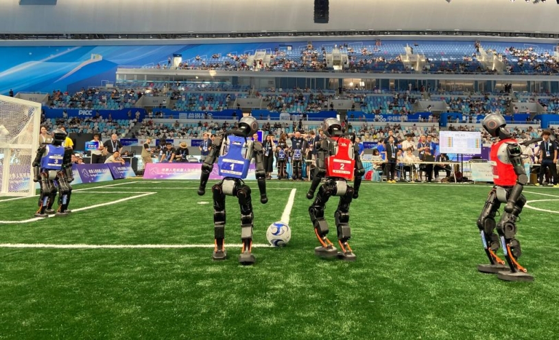 记者看到,机器人球员们激烈比拼,不停寻找方向和目标,迅速变换阵型和方位,踱步向前,带球、踢球。比赛期间,不时有机器人摔倒,然后被人类队友“拖走”到场边进行微调休整,之后重新上场。当身穿红色队服的清华火神队1号队员灵巧地突破对方几名队员防守,扬起一脚将球踢进对方球门,现场立刻沸腾起来,掌声雷动,场边的清华学子——团队成员也激动地拥抱在一起,庆贺来之不易的胜利。
